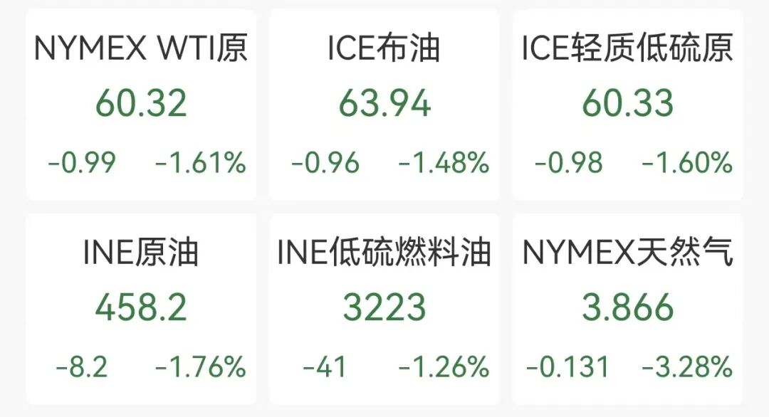 原油期货集体飘绿,WTI原油、ICE布油等均跌超1%。