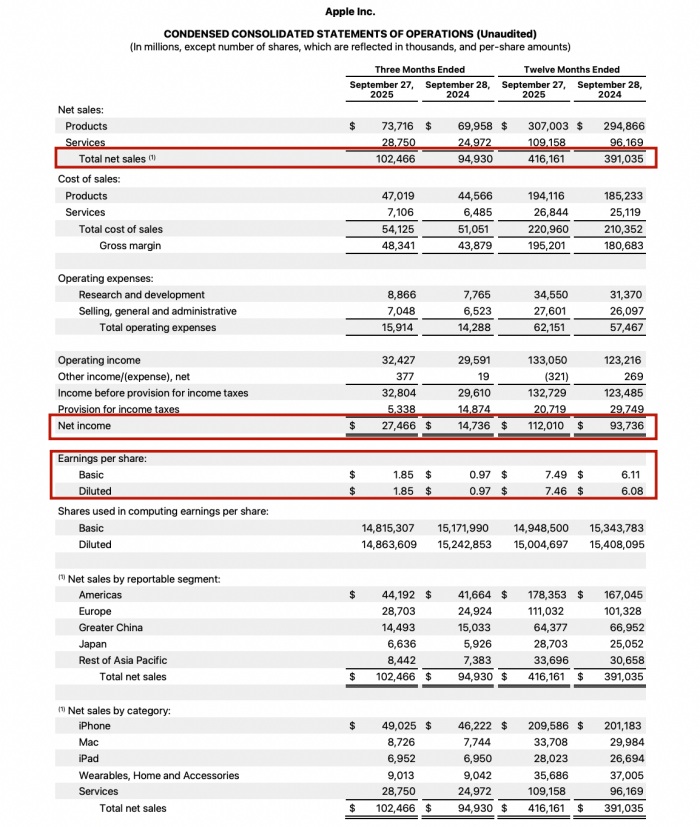 北京时间10月31日,苹果公司(NASDAQ:AAPL)发布了截至9月27日的2025财年第四季度及全年财报。财报显示,苹果第四财季总营收为1024.66亿美元,创同期历史纪录,较上年同期的949.30亿美元增长8%;净利润达274.66亿美元,较上年同期的147.36亿美元大幅增长86%;每股摊薄收益为1.85美元,较上年同期的0.97美元增长91%,三大核心财务指标均呈现强劲增长态势。