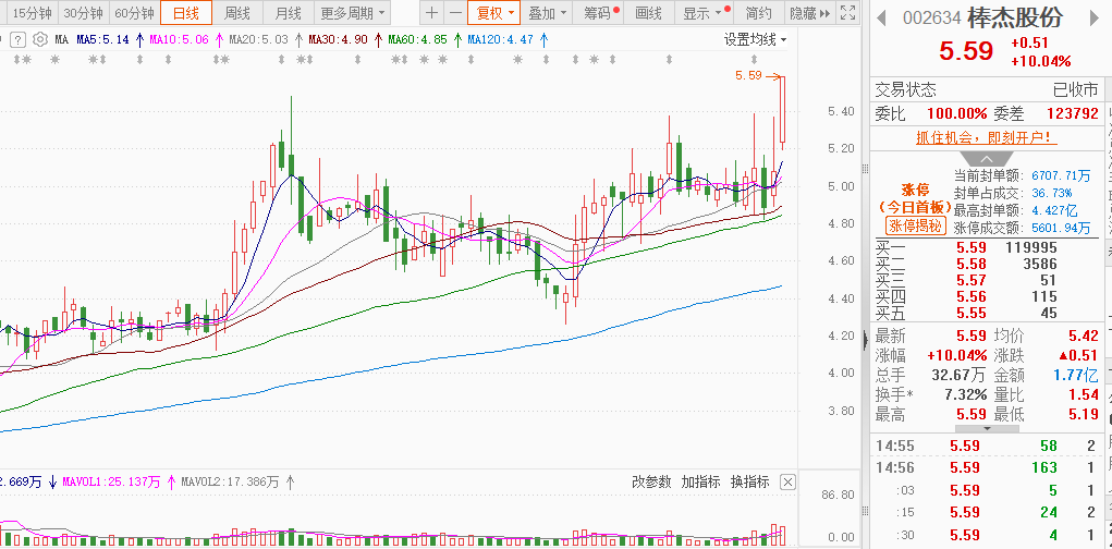 棒杰股份:该股是光伏+服装家纺。周一首板涨停后股价突破5.4的前高压力,均线粘合向上走加速拉升迹象,突破新高后上涨空间打开,封单6700多万,有继续向上爆发可能,周二可以在5.4上方找找机会。