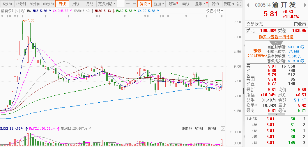 渝开发:房地产。该股周四放量涨停,首板,封单9000万左右,目前在半年线附近涨停,处于横盘筑底阶段有加速迹象,不过均线还没有完全形成向上的多头趋势,该股周四主利阶段性拉升三次,控盘明显,短期可能会有加速,也只能考虑短线。