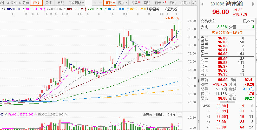 鸿富瀚:消费电子+锂电池,该股一直处于主升浪阶段,从底部到现在三次拉升两次回撤,但每次回撤都在30均线附近没有跌破,且每次回踩后都能创新高,这次再次放了拉升破91附近的新高,上涨得到加强,趋势延续,均线向上发散,股价突破新高后,这个位置可以当做支撑,周五股价回撤不跌破这个位置,说明向上拉升概率偏大。