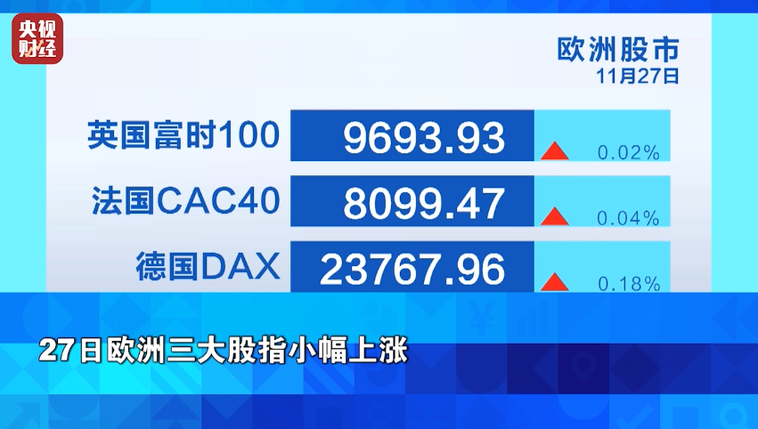 欧洲方面,欧盟统计局周四公布的一系列数据显示,衡量多个经济领域企业信心的欧元区经济景气指数从10月份的96.8升至11月份的97,其中,对服务业信心的改善较为突出。由于订单减少,出口增长仍存在不确定性,工业部门的信心有所下滑。由于美股休市,欧洲股市交易也较为清淡,三大股市当天小幅收涨。截至当天收盘,英国富时100指数上涨0.02%,法国CAC40指数上涨0.04%,德国DAX指数涨幅为0.18%。