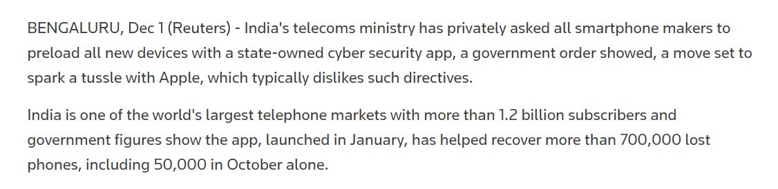 路透:一份政府命令显示,印度电信部已私下要求包括苹果、三星、Oppo、vivo与小米在内的所有智能手机制造商在所有新设备上预装国有网络安全应用程序Sanchar Saathi,且规定用户不能禁用该应用。对于已进入供应链的设备,手机制造商需要通过软件更新的方式推送进手机。