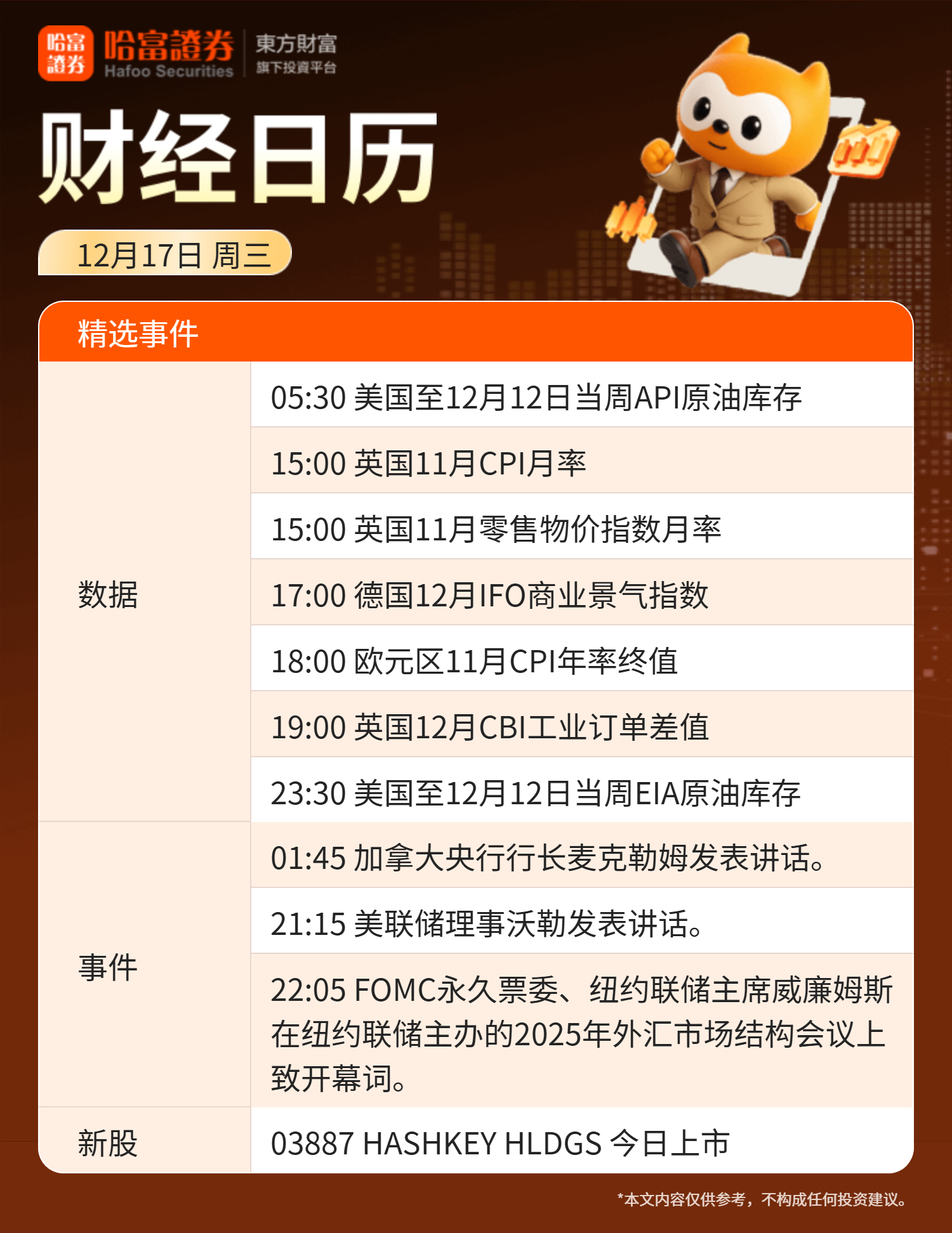 美股市场:美股三大指数12月16日收盘涨跌不一,道指、标普连跌三日。截至收盘,道琼斯工业平均指数比前一交易日下跌302.3点,收于48114.26点,跌幅为0.62%;标准普尔500种股票指数下跌16.25点,收于6800.26点,跌幅为0.24%;纳斯达克综合指数上涨54.05点,收于23111.46点,涨幅为0.23%。