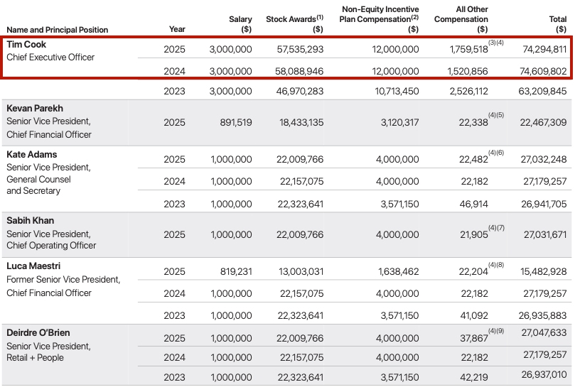 库克的薪酬结构主要由四部分组成:300万美元基本工资(自2016年起未调整)、5750万美元股票奖励、1200万美元绩效现金奖励,以及176万美元其他补偿。2025年其他补偿部分较2024年的152万美元增加24万美元,主要涵盖401(k)退休金缴纳、人寿保险、安全支出及私人航空出行费用。