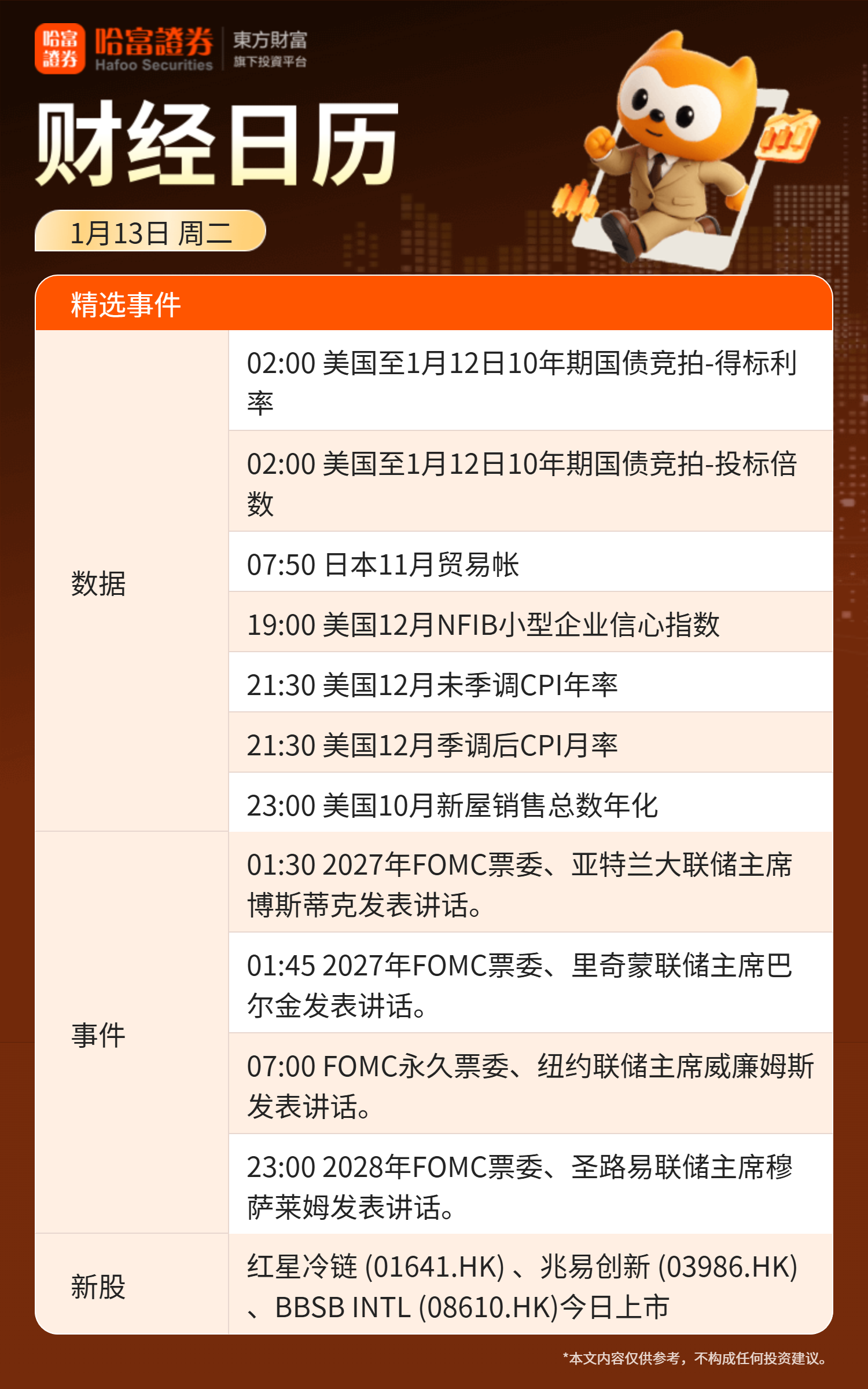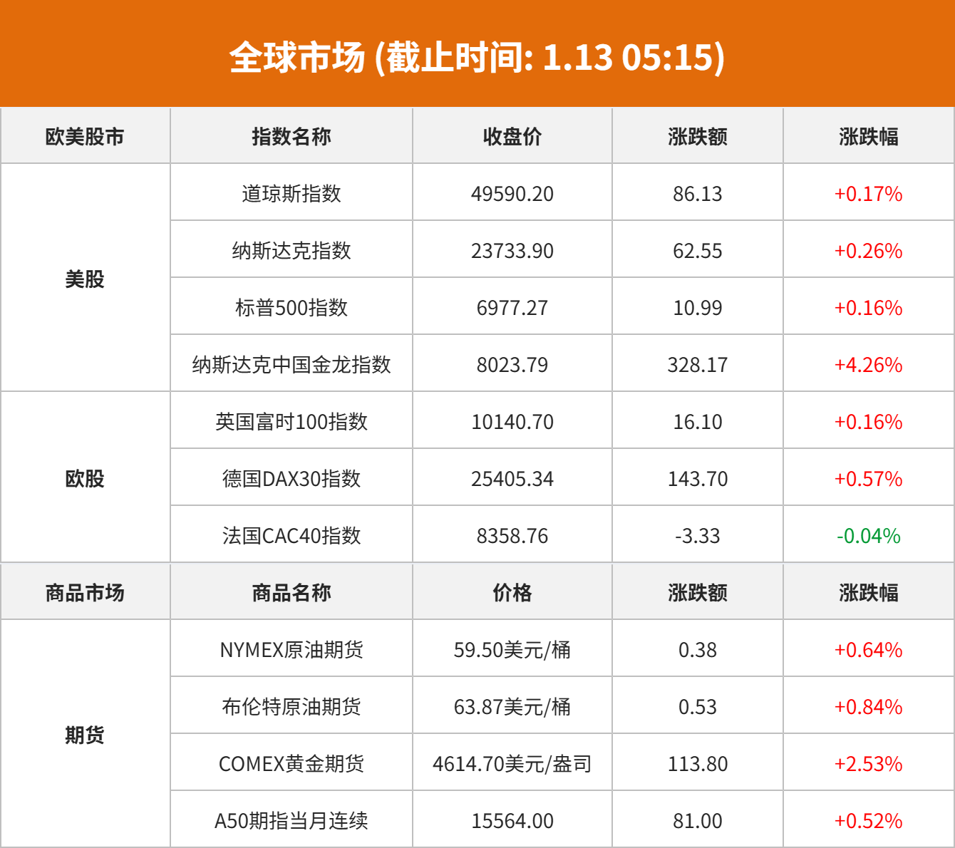 美股市场:美股三大指数01月12日收盘全线上涨,道指与标普创历史新高。截至收盘,道琼斯工业平均指数比前一交易日上涨86.13点,收于49590.2点,涨幅为0.17%;标准普尔500种股票指数上涨10.99点,收于6977.27点,涨幅为0.16%;纳斯达克综合指数上涨62.55点,收于23733.9点,涨幅为0.26%。