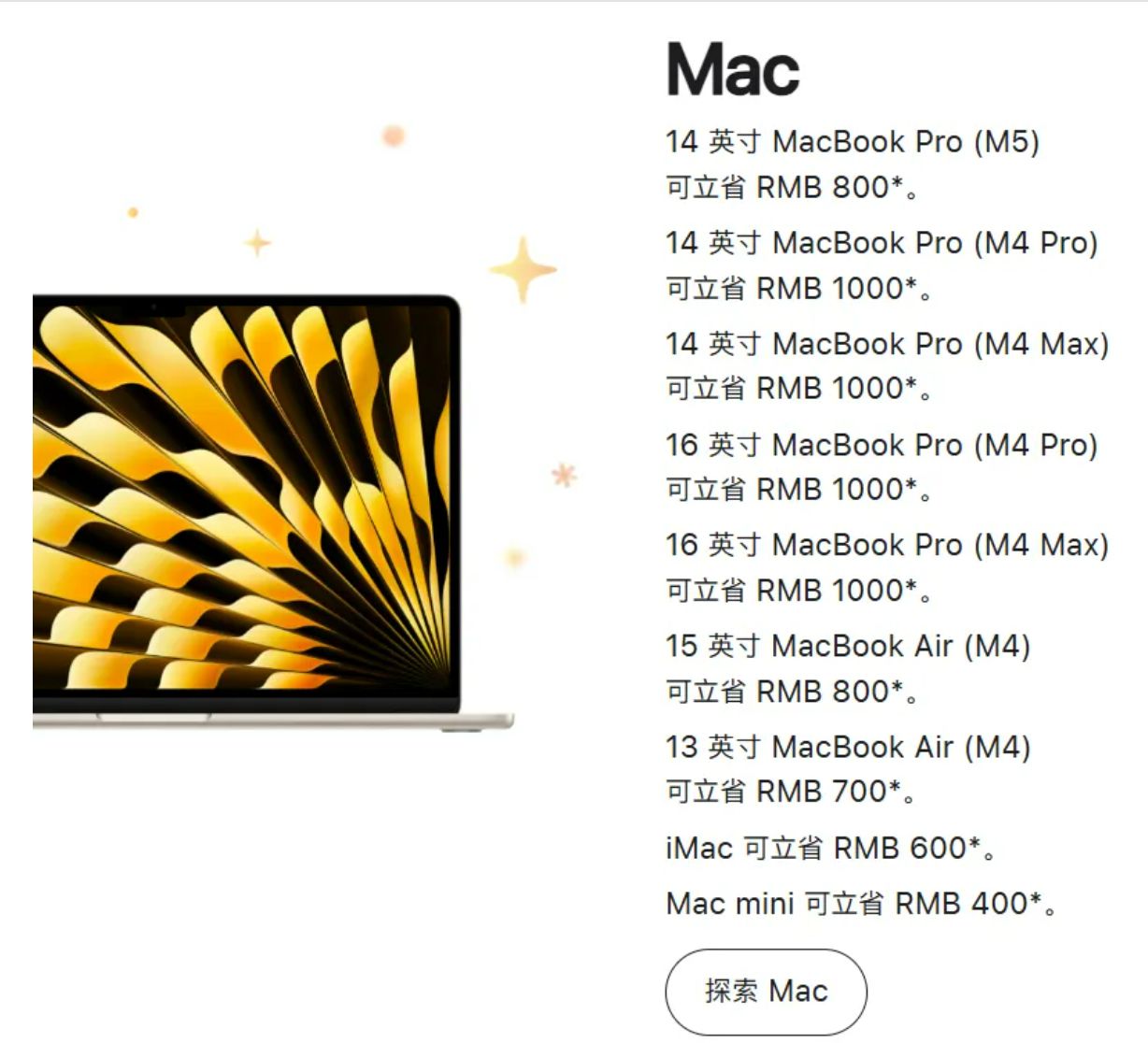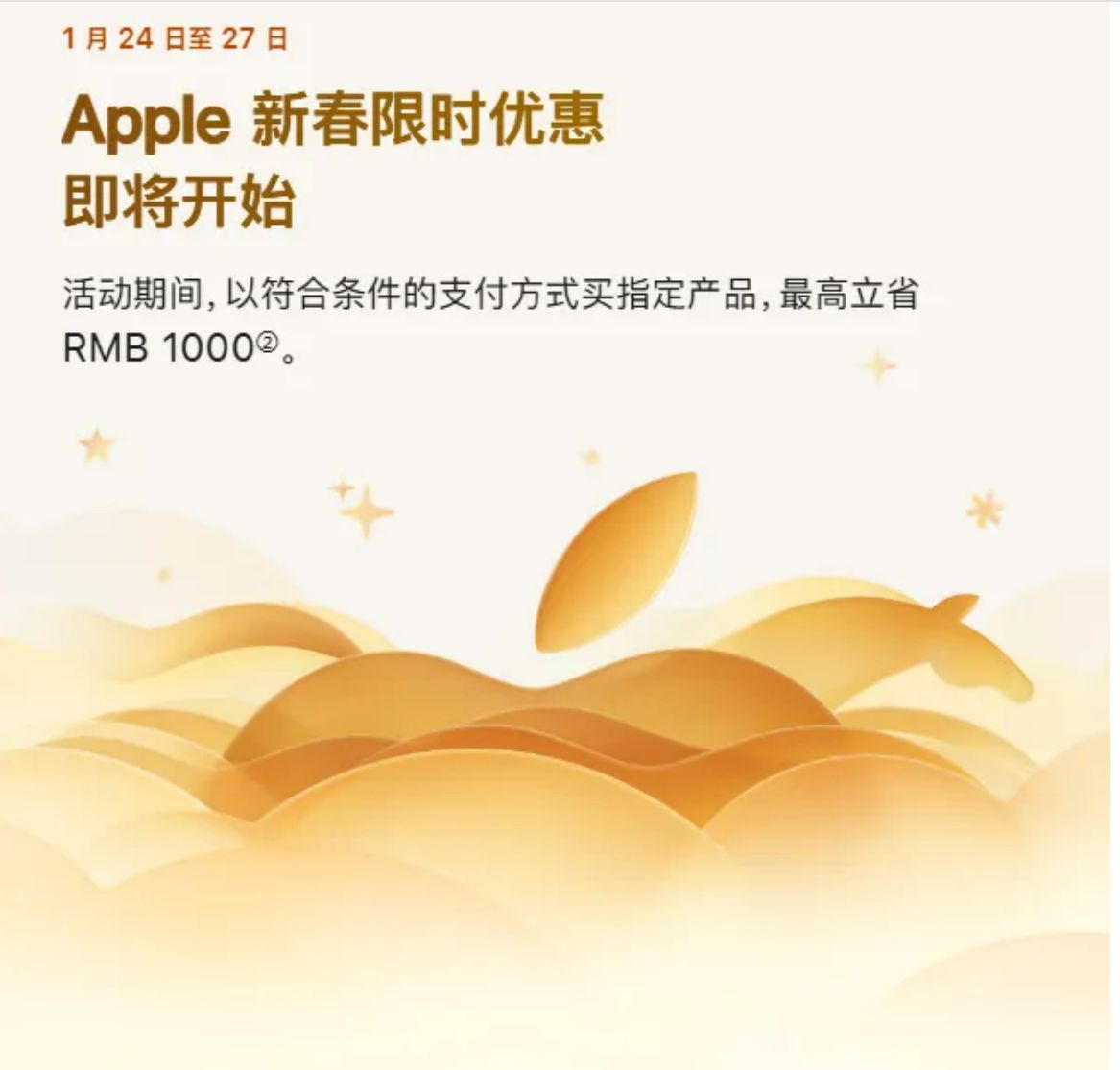 1月22日消息,苹果中国官网现已上线新春限时优惠活动,用户于2026年1月24日0时1分至1月27日23时59分以符合条件的支付方式买指定产品最高立省1000元。