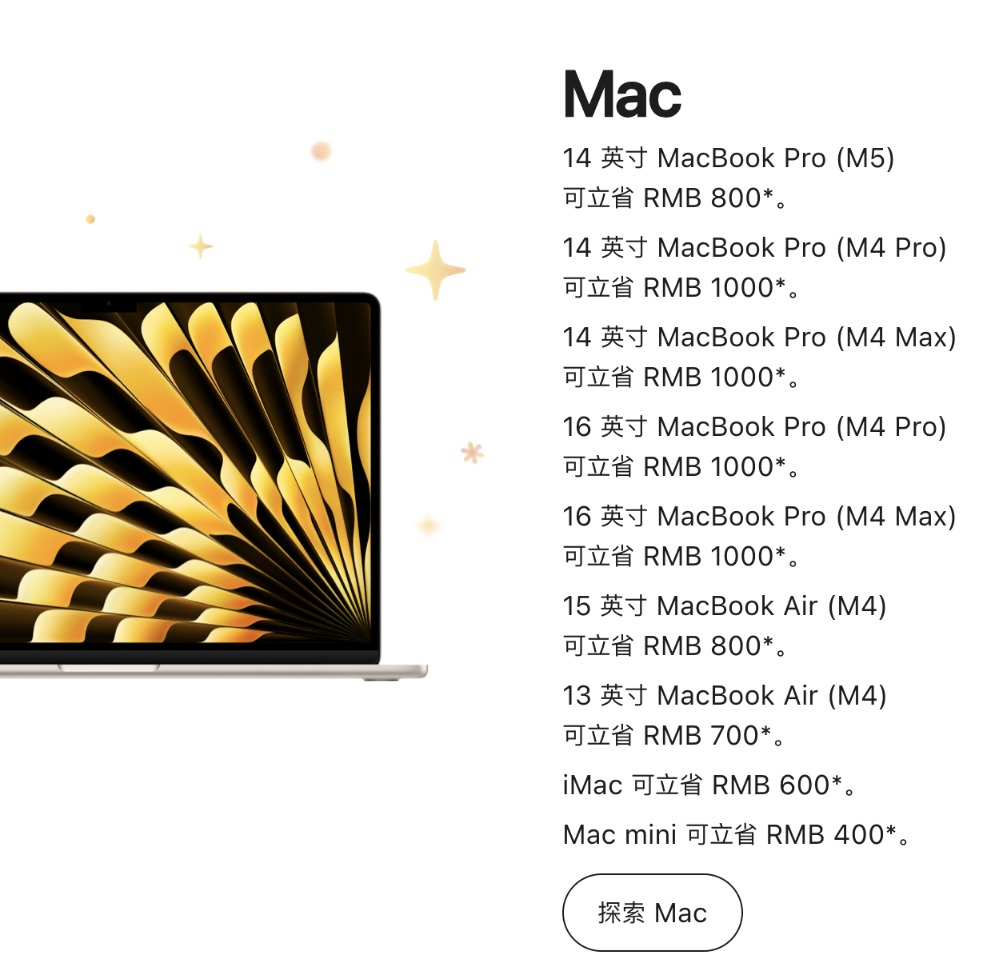 Mac系列成为降价力度最大的产品。14英寸MacBook Pro(M4 Pro)、MacBook Pro(M4 Max)以及16英寸MacBook Pro(M4 Pro)、MacBook Pro(M4 Max)可立减1000元,降幅最大;Mac mini、iMac以及MacBook Air等则降价400元到800元不等。
