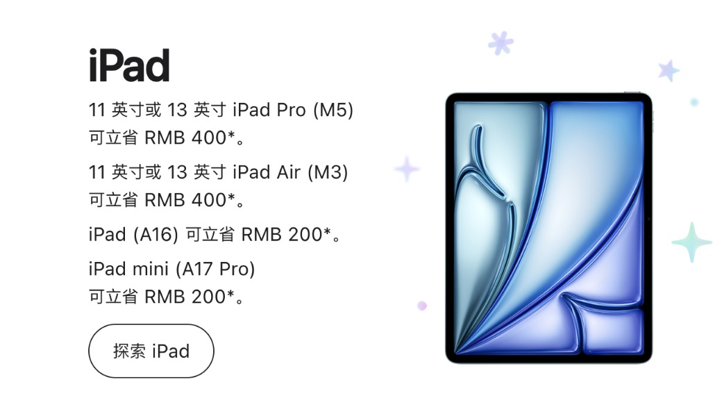 iPad降幅不算很大,其中iPad mini (A17 Pro)、iPad (A16) 降200元,11英寸或13英寸iPad Pro、iPad Air均降价400元。
