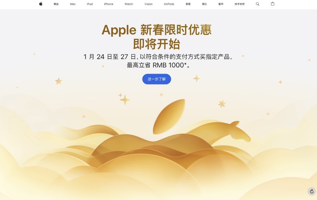 1月22日,苹果中国官网上线新春限时优惠活动,用户于2026年1月24日至27日以符合条件的支付方式购买iPhone、Mac、iPad和Apple Watch等指定产品最高立省1000元。手机产品方面,活动覆盖iPhone 16、iPhone 16 Plus及iPhone 16e,iPhone 17系列不在活动范围内。