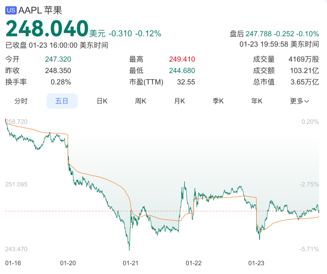 不过,近段时间苹果股价已连续八周下跌,为自2022年5月以来最长连跌纪录。在这八周的下跌周期内,苹果股价累计下挫近12%。对苹果股价而言,下一个关键时间点是1月29日,届时公司将公布第一财季业绩。