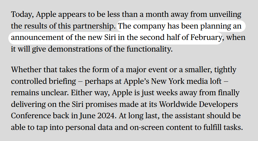 彭博社苹果记者Mark Gurman报道称,由谷歌Gemini驱动的新版Siri将在2月下旬iOS