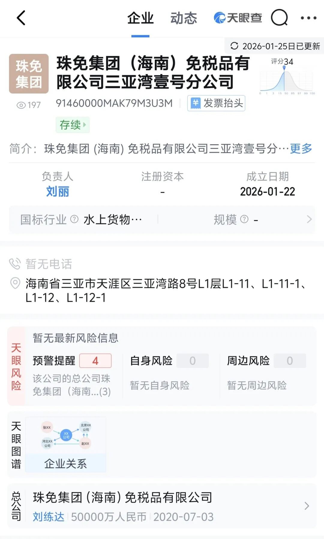据天眼查,珠免集团(海南)免税品有限公司三亚湾壹号分公司于2026年1月22日成立,经营范围涵盖海关监管货物仓储服务、酒类经营、食品经营管理、食品销售、玩具销售、母婴用品销售、日用杂品销售等。