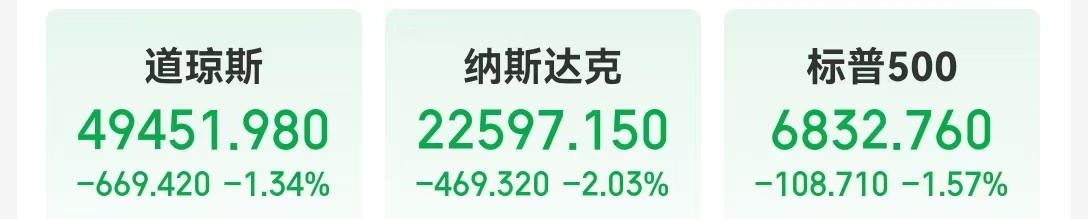 在重磅CPI通胀数据公布前一日,投资者对人工智能(AI)颠覆性的担忧持续发酵。当地时间2月12日,美股三大指数集体收跌,道指下跌669.42点,跌幅1.34%;纳指跌2.03%;标普500指数跌1.57%。