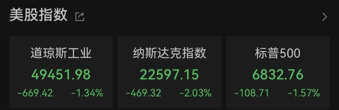 当地时间2月12日,Wind数据显示,截至收盘,道琼斯工业指数跌669.42点,跌幅为1.34%,报49451.98点;纳斯达克指数跌469.32点,跌幅为2.03%,报22597.15点;标普500指数跌108.71点,跌幅为1.57%,报6832.76点。