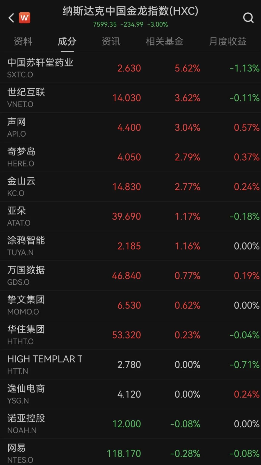 中概股涨跌不一,纳斯达克中国金龙指数下跌3%。热门中概股方面,中国苏轩堂药业涨超5%,世纪互联、声网涨超3%,奇梦岛、金山云涨超2%;腾讯音乐、虎牙跌超10%,新氧下跌6.76%,贝壳、爱奇艺跌超5%。