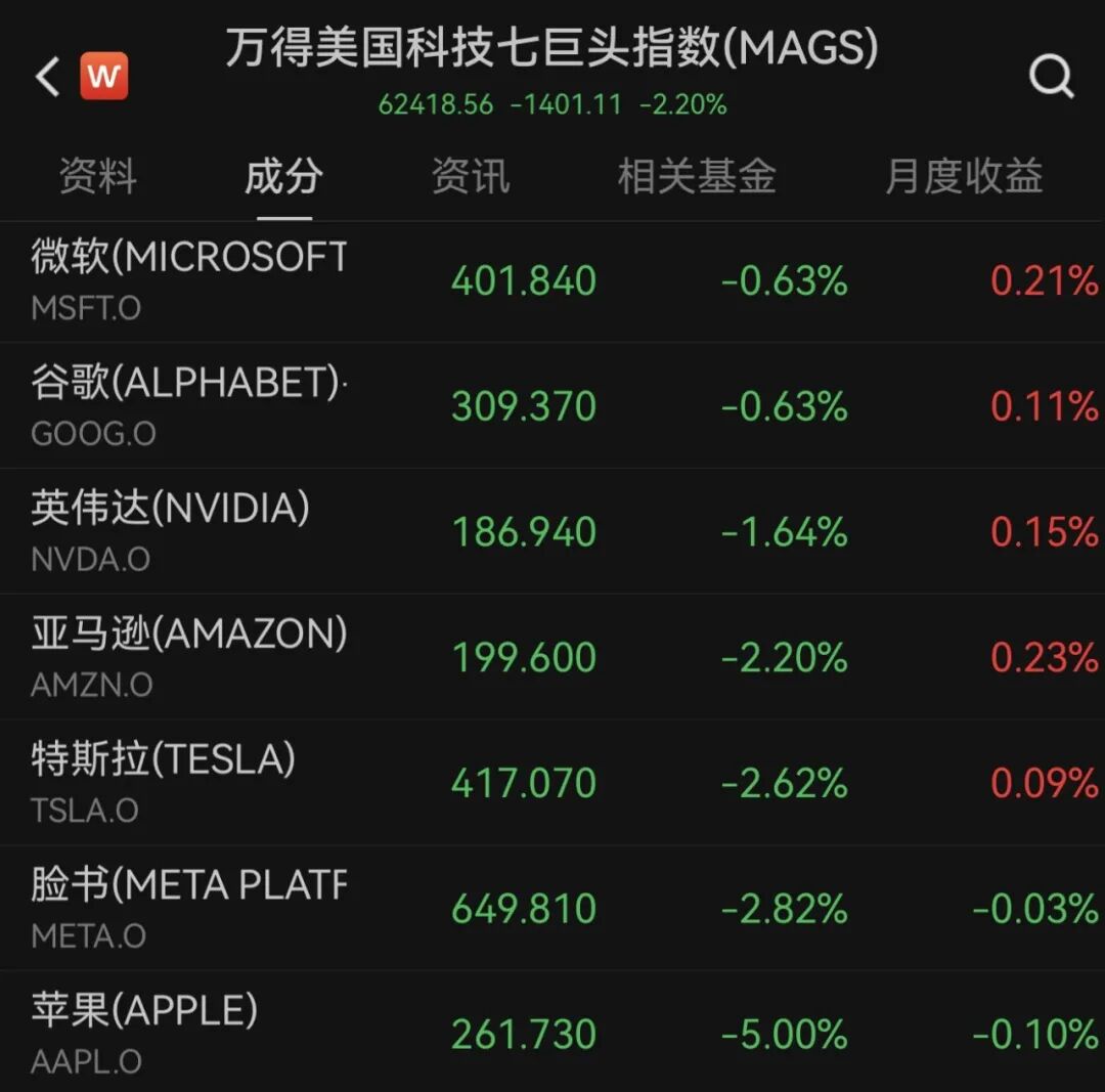 美股科技七巨头全部下跌,万得美国科技七巨头指数下跌2.20%。其中,苹果大跌5%,为2025年4月以来的最大单日跌幅。Meta、特斯拉、亚马逊跌超2%,英伟达下跌1.64%,谷歌母公司Alphabet-C、微软均下跌0.63%。