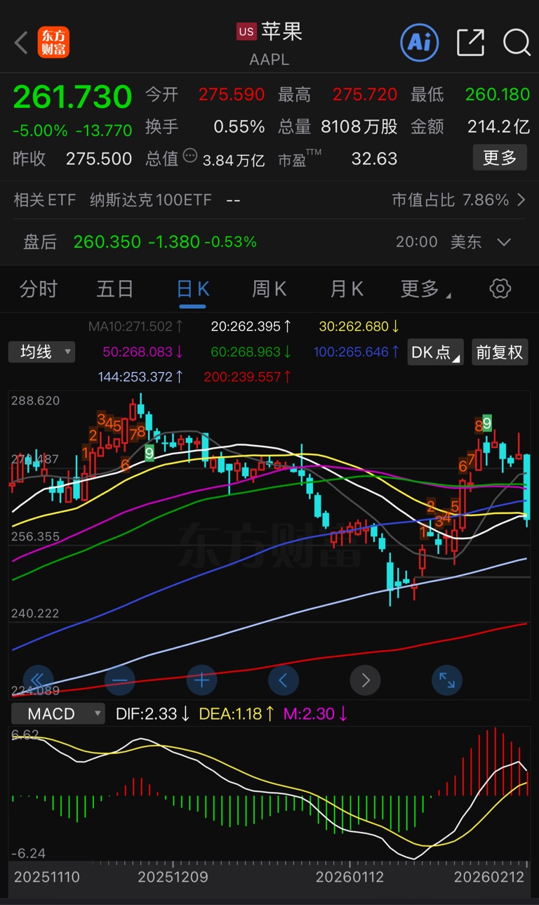 一阴穿六线,苹果十几年的上升趋势彻底终结,开始下跌寻底。走势应该与茅台2600下来时差不多,直到PE企稳在10以内。