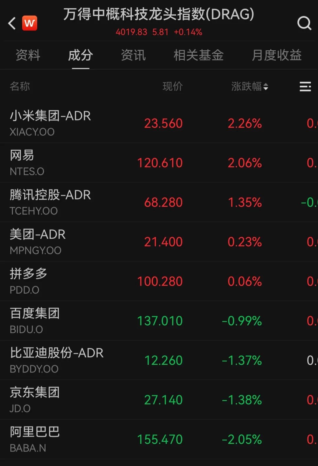 中概股走势分化。纳斯达克中国金龙指数下跌0.10%,万得中概科技龙头指数上涨0.14%。个股表现不一,小米集团-ADR、网易涨超2%,腾讯控股-ADR涨超1%,美团-ADR、拼多多微涨;阿里巴巴跌超2%,京东集团、比亚迪股份-ADR跌超1%,百度集团跌0.99%。
