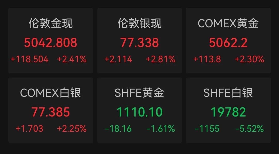 降息预期升温叠加避险需求回升,推动贵金属价格走高。截至北京时间6:03,伦敦金现货价格涨2.41%,报5042.808美元/盎司,盘中最高报5046.261美元/盎司;COMEX黄金期货价格涨2.3%,报5062.2美元/盎司,盘中最高报5069.1美元/盎司;伦敦银现货价格涨2.81%,报77.338美元/盎司,盘中最高报79.339美元/盎司,COMEX白银期货价格上涨2.25%,报77.385美元/盎司,盘中最高报79.265美元/盎司。