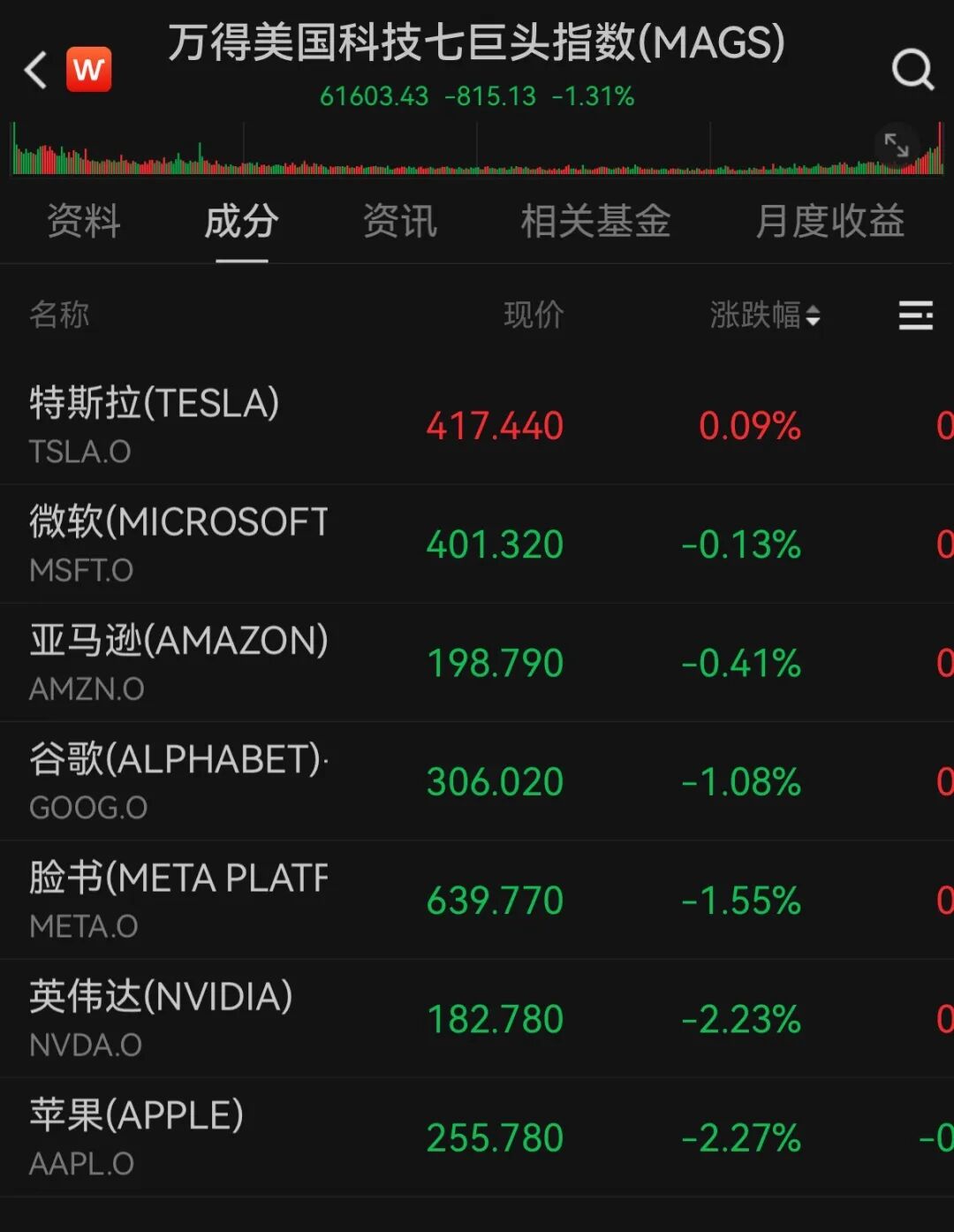大型科技股整体承压。万得美国科技七巨头指数下跌1.31%。其中,苹果、英伟达跌超2%,Meta、谷歌母公司Alphabet-C跌逾1%,亚马逊、微软小幅下跌,特斯拉微涨0.09%。