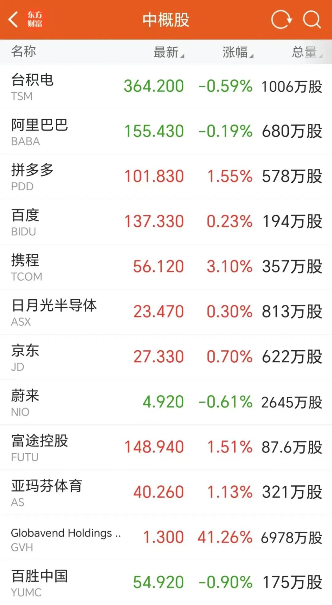 热门中概股涨跌不一,台积电跌0.59%,阿里巴巴跌0.19%,拼多多涨1.55%,百度涨0.23%,携程涨3.10%,京东涨0.70%,蔚来跌0.61%,富途控股涨1.51%,亚玛芬体育涨1.13%。