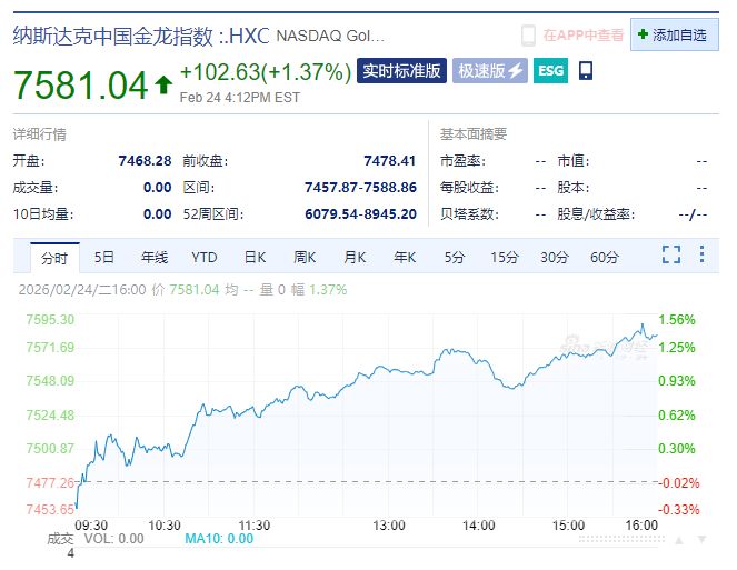 纳斯达克中国金龙指数涨1.37%。