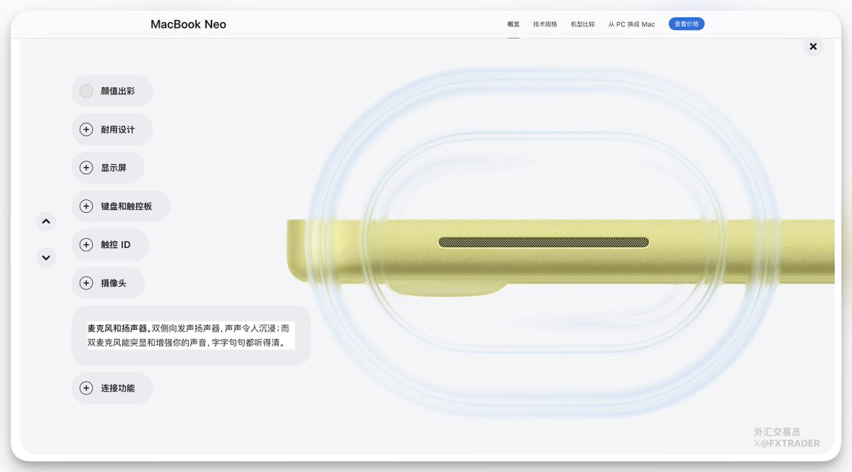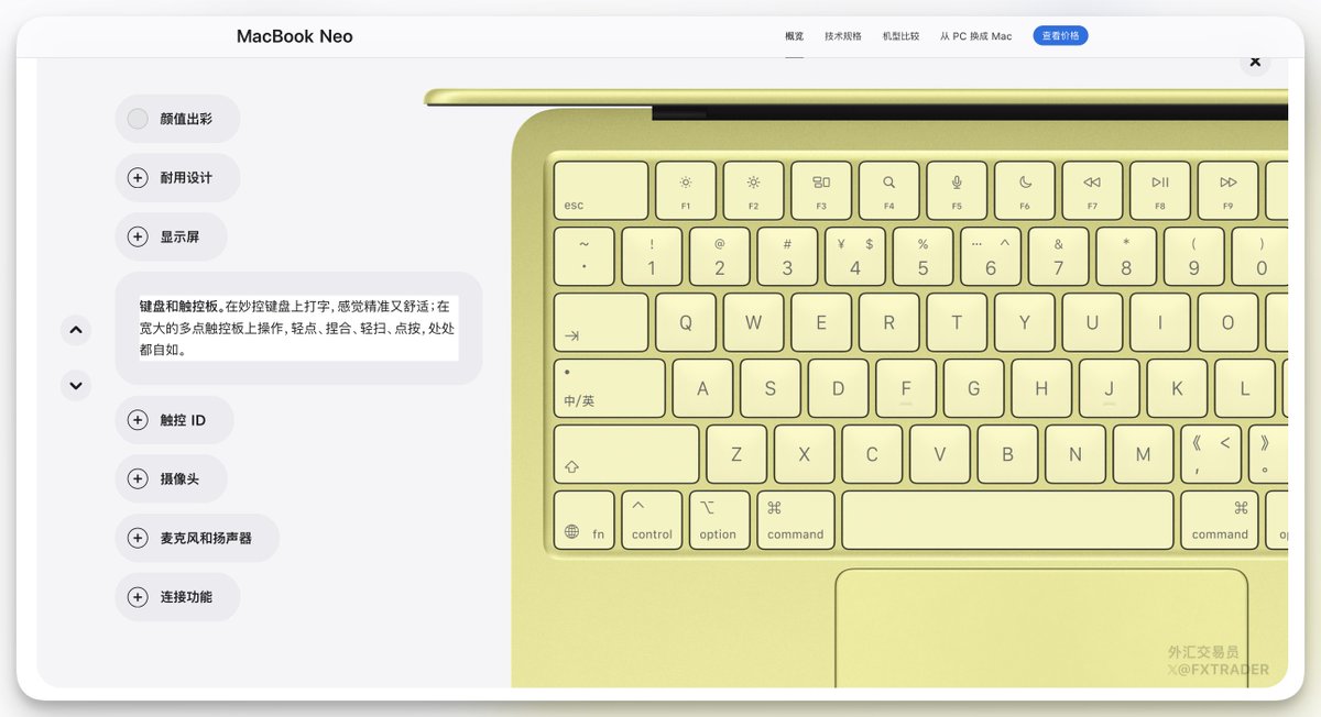 苹果新品发布周第三天,推出入门级Macbook Neo,搭载A18 Pro芯片(MacOS首次运行在iPhone级芯片),电池续航16小时,500尼特13英寸Liquid视网膜屏、8GB+256/512GB,无MagSafe磁吸充电,只有双USB-C接口,4599元起。