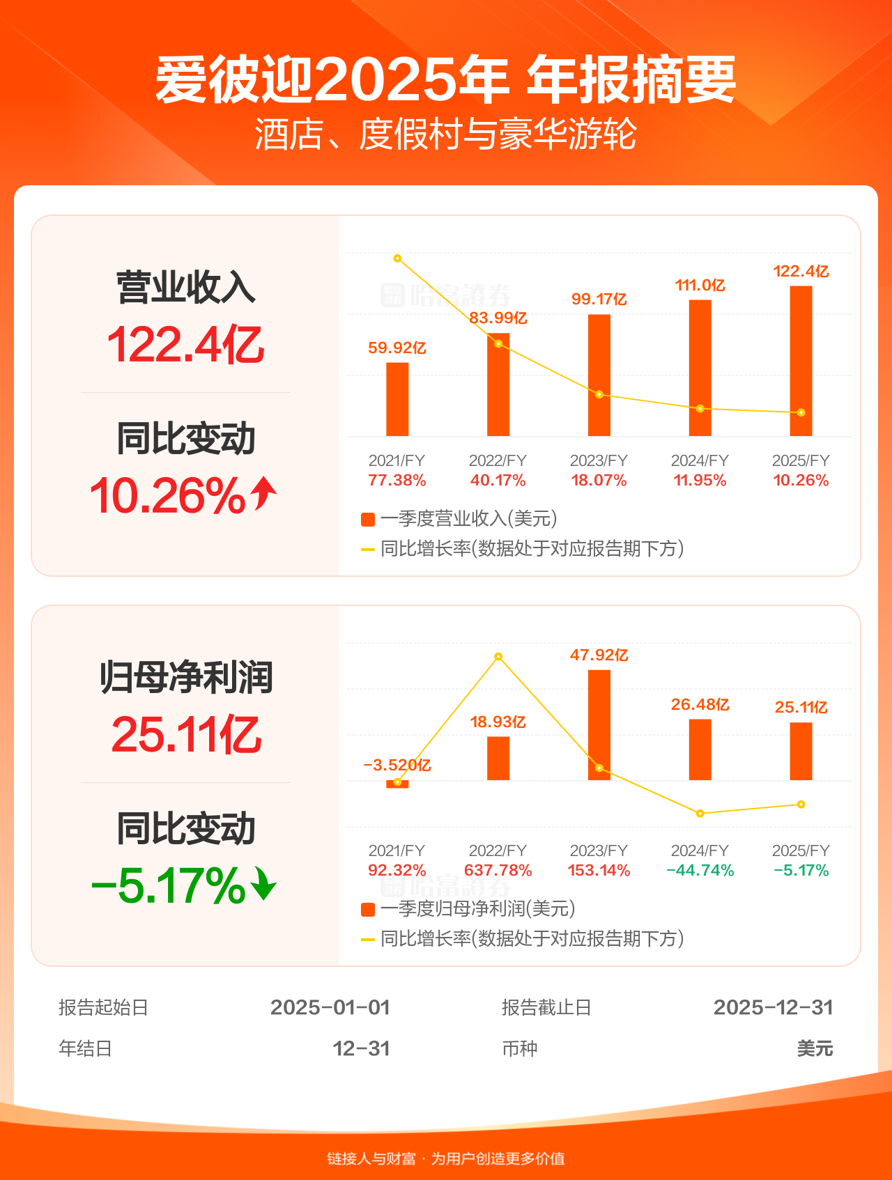 爱彼迎2月12日发布年报业绩,截至2025年12月31日的12个月内,该公司营业收入122.41亿美元,同比增长10.26%;公司权益持有人应占溢利(归母净利润)25.11亿美元,同比减少5.17%。