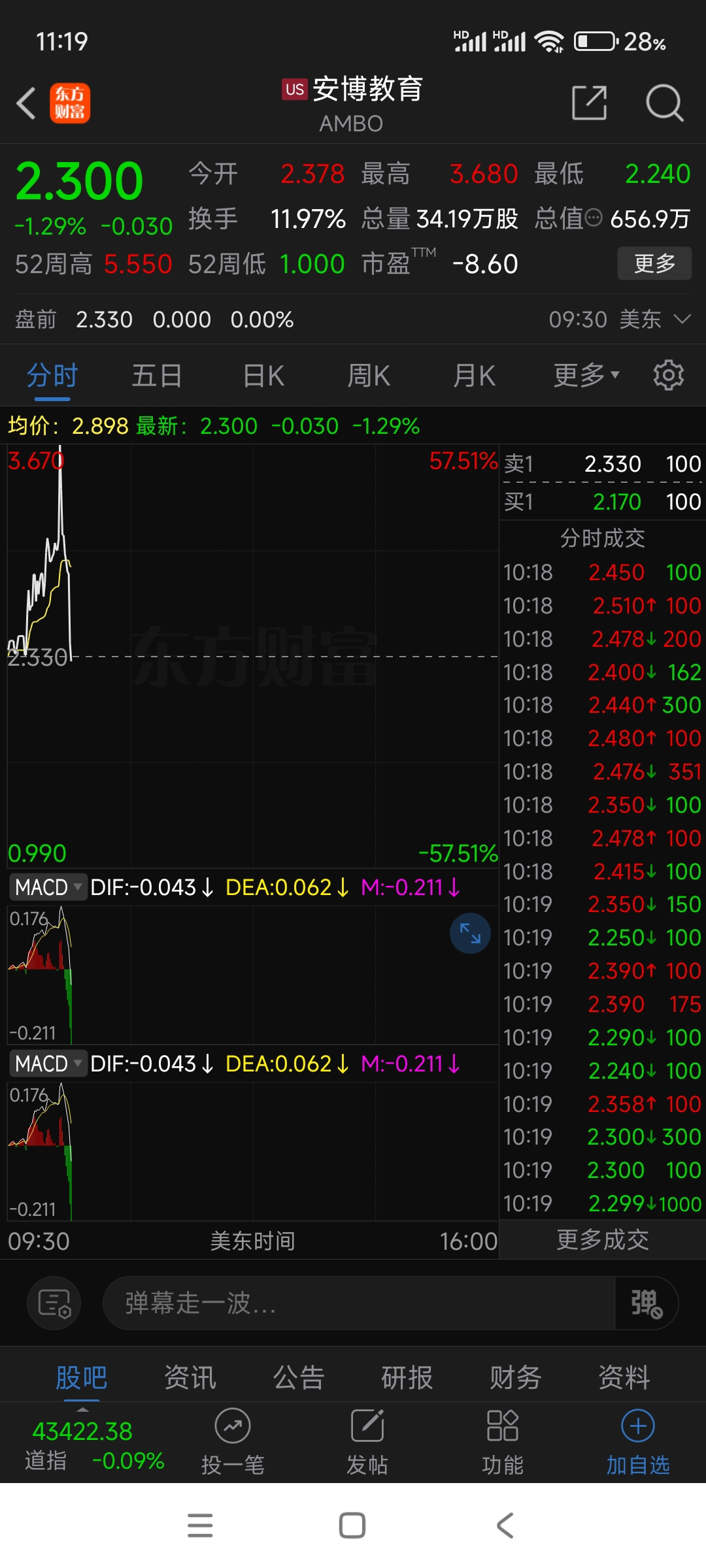 $安博教育(AMEX|AMBO)$ 涨50个点到绿盘一分钟时间不到!