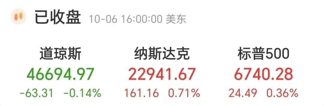 美股三大指数当地时间周一(10月06日)收盘涨跌不一。截至收盘,道琼斯工业平均指数比前一交易日下跌63.31点,收于46694.97点,跌幅为0.14%;标准普尔500种股票指数上涨24.49点,收于6740.28点,涨幅为0.36%;纳斯达克综合指数上涨161.16点,收于22941.67点,涨幅为0.71%。纳指、标普500指数创收盘新高。