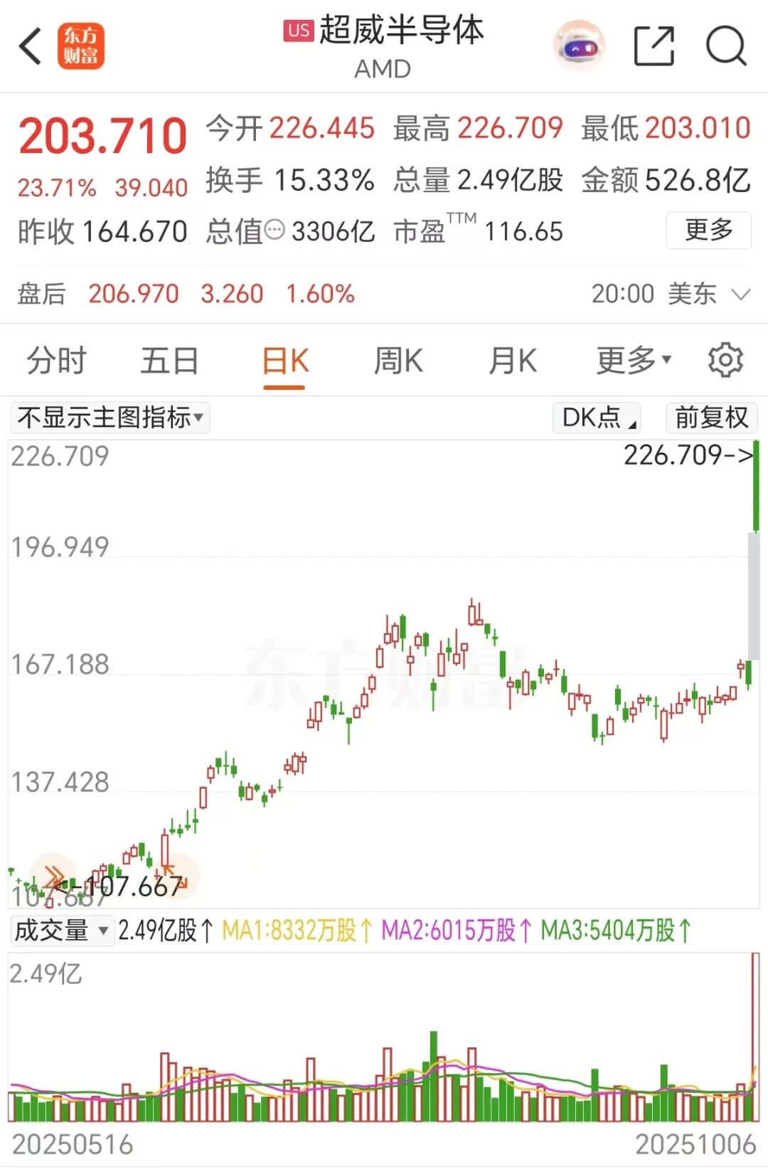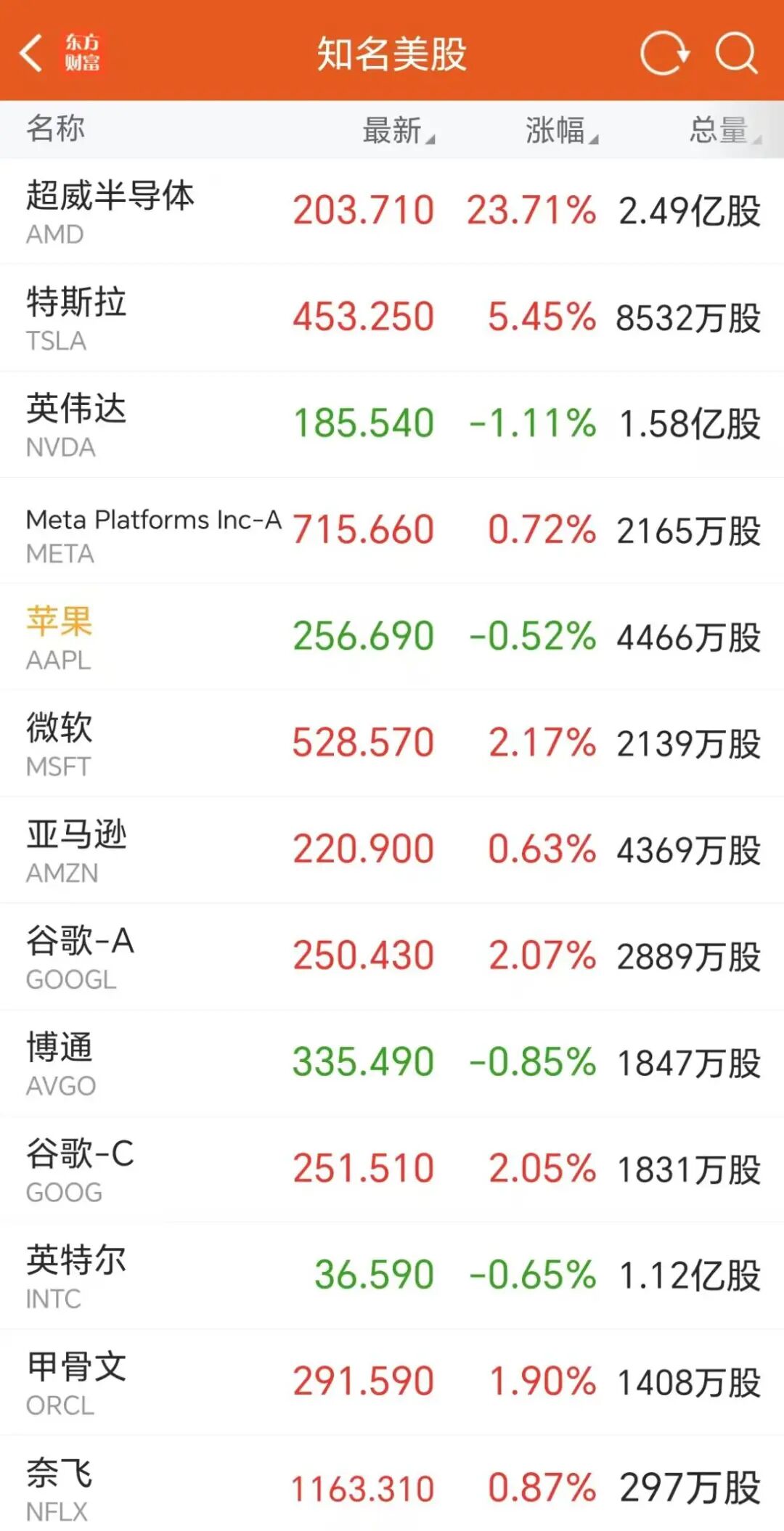 当地时间周一,以芯片股和AI概念股为主的科技股延续涨势,受利好消息提振,英伟达的竞争对手,市值超2万亿人民币的超威半导体(AMD)周一收盘狂涨超23%。
