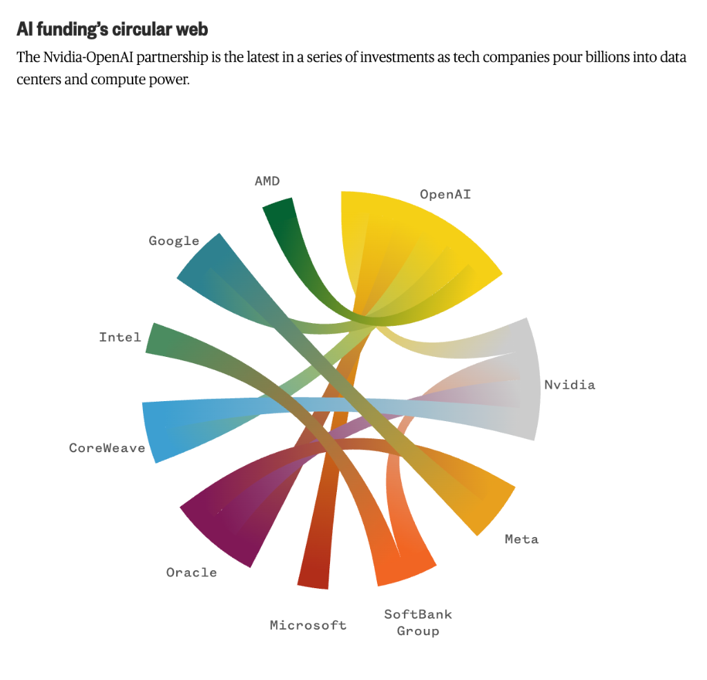 Altman构建的这张利益网远不止于芯片制造商。实际上,放眼全局,一个精心设计的、盘根错节的关系网已经形成。