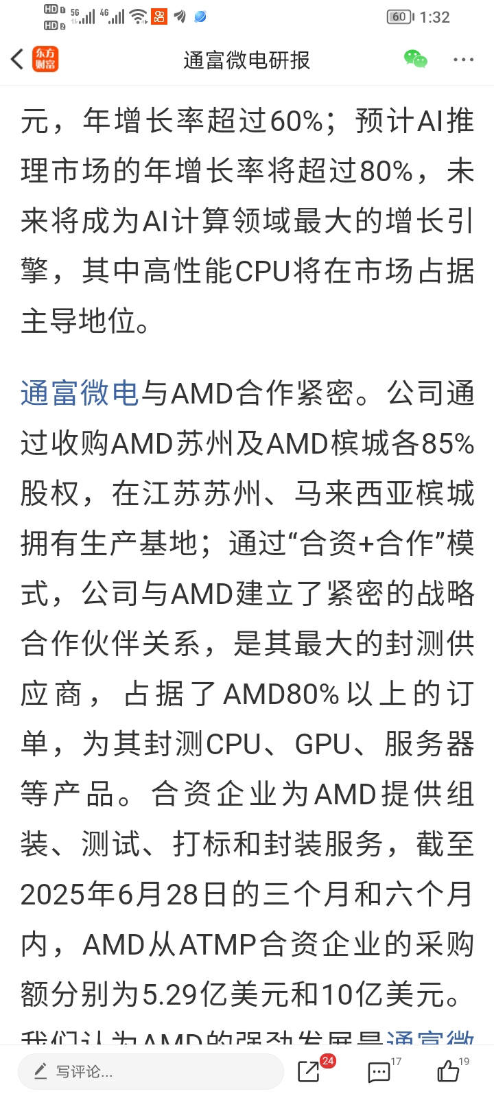 通富微电与AMD合作紧密。公司通过收购AMD苏州及AMD槟城各85%股权,在江苏苏州、马来西亚槟城拥有生产基地;通过“合资 合作”模式,公司与AMD建立了紧密的战略合作伙伴关系,是其最大的封测供应商,占据了AMD80%以上的订单,为其封测CPU、GPU、服务器等产品。合资企业为AMD提供组装、测试、打标和封装服务,截至2025年6月28日的三个月和六个月内,AMD从ATMP合资企业的采购额分别为5.29亿美元和10亿美元。我们认为AMD的强劲发展是通富微电重要的增长引擎,其现有业务为公司的营收提供了稳健基石,而AMD未来的增长潜力更将为通富微电注入持续的发展动能。