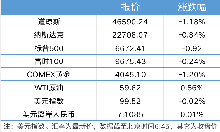 1、美股三大指数集体收跌,道指跌557点,跌幅1.18%,标普500指数跌0.92%,纳斯达克综合指数跌0.84%;大型科技股多数下跌,AMD、英特尔跌超2%,英伟达、苹果、甲骨文、Meta跌超1%,谷歌逆势涨超3%;黄金矿业股普跌,赫克拉矿业跌超4%,金田、哈莫尼黄金跌超3%;加密货币概念股走弱,Coinbase跌超7%,Circle跌超6%。中概股多数下跌,纳斯达克中国金龙指数跌1.21%,小鹏汽车跌超10%,理想汽车跌超4%,网易、百度、蔚来跌超1%,阿里巴巴涨超2%。