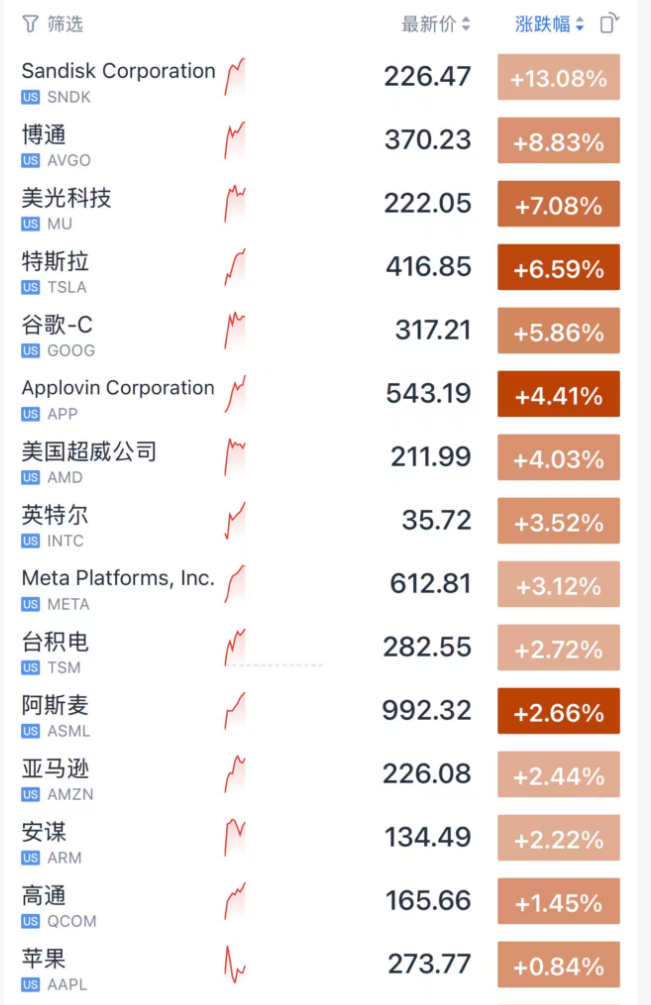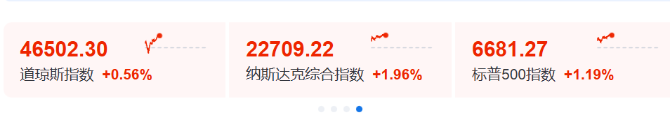 半导体厂商超威半导体(AMD)和美光涨幅居前,特斯拉和谷歌母公司Alphabet的股价也均上涨约6%。这些走势共同推动纳斯达克综合指数大涨近2%。
