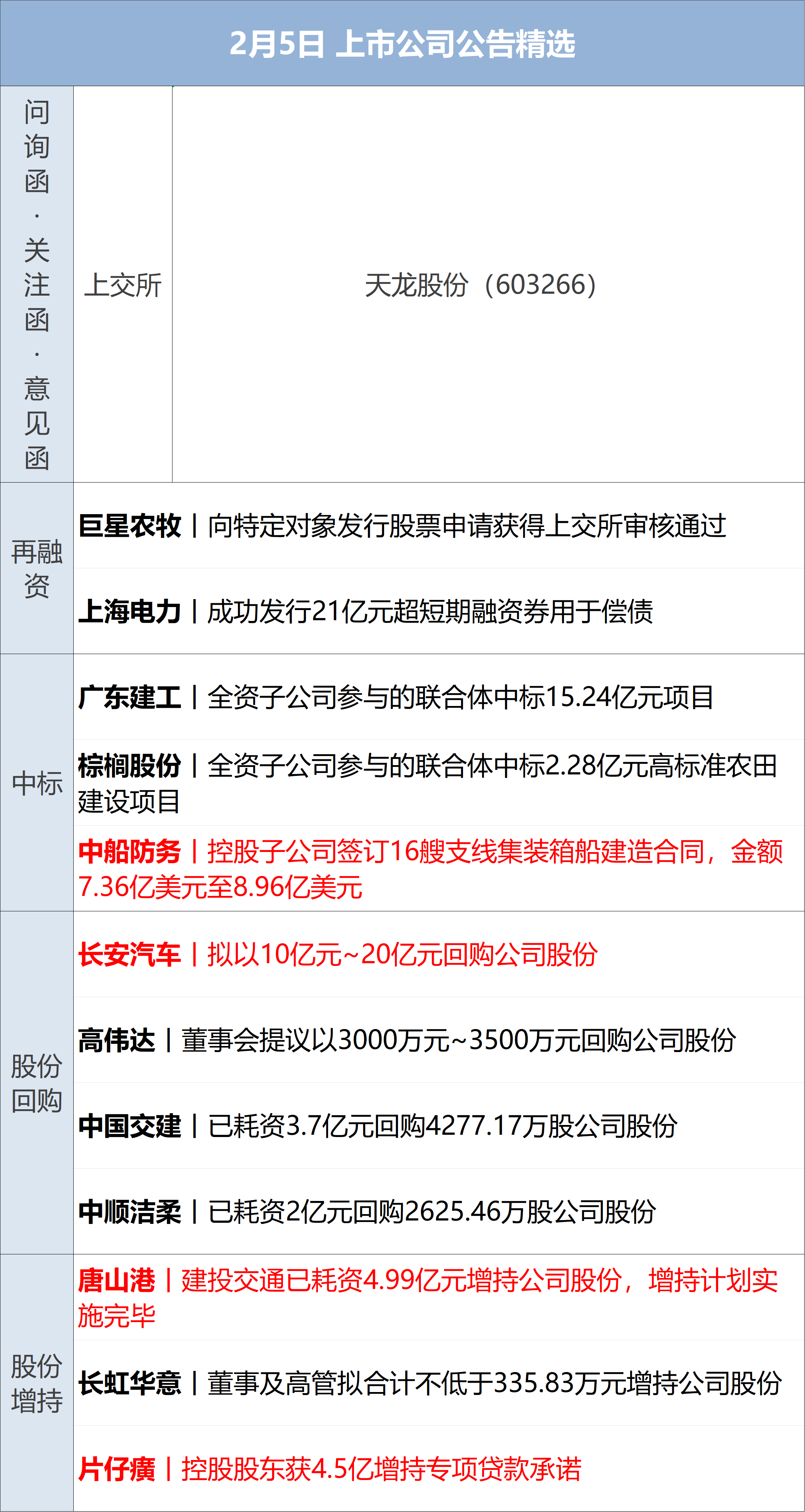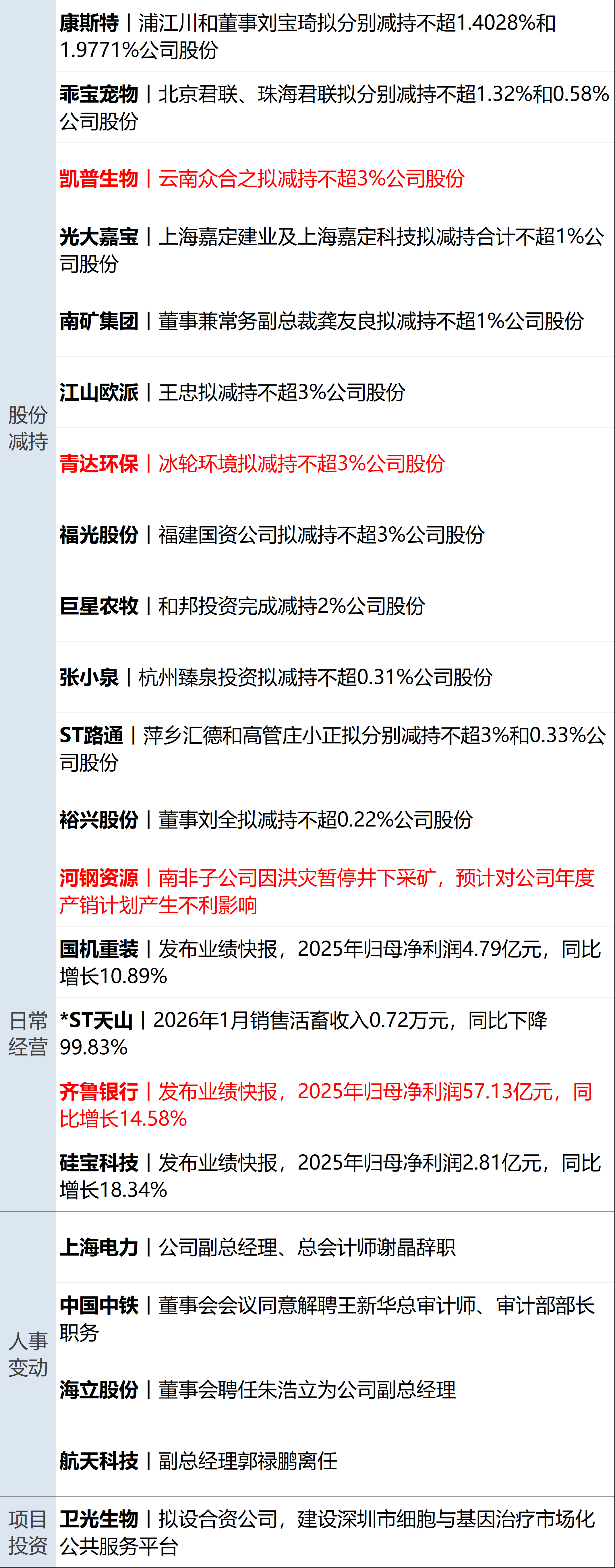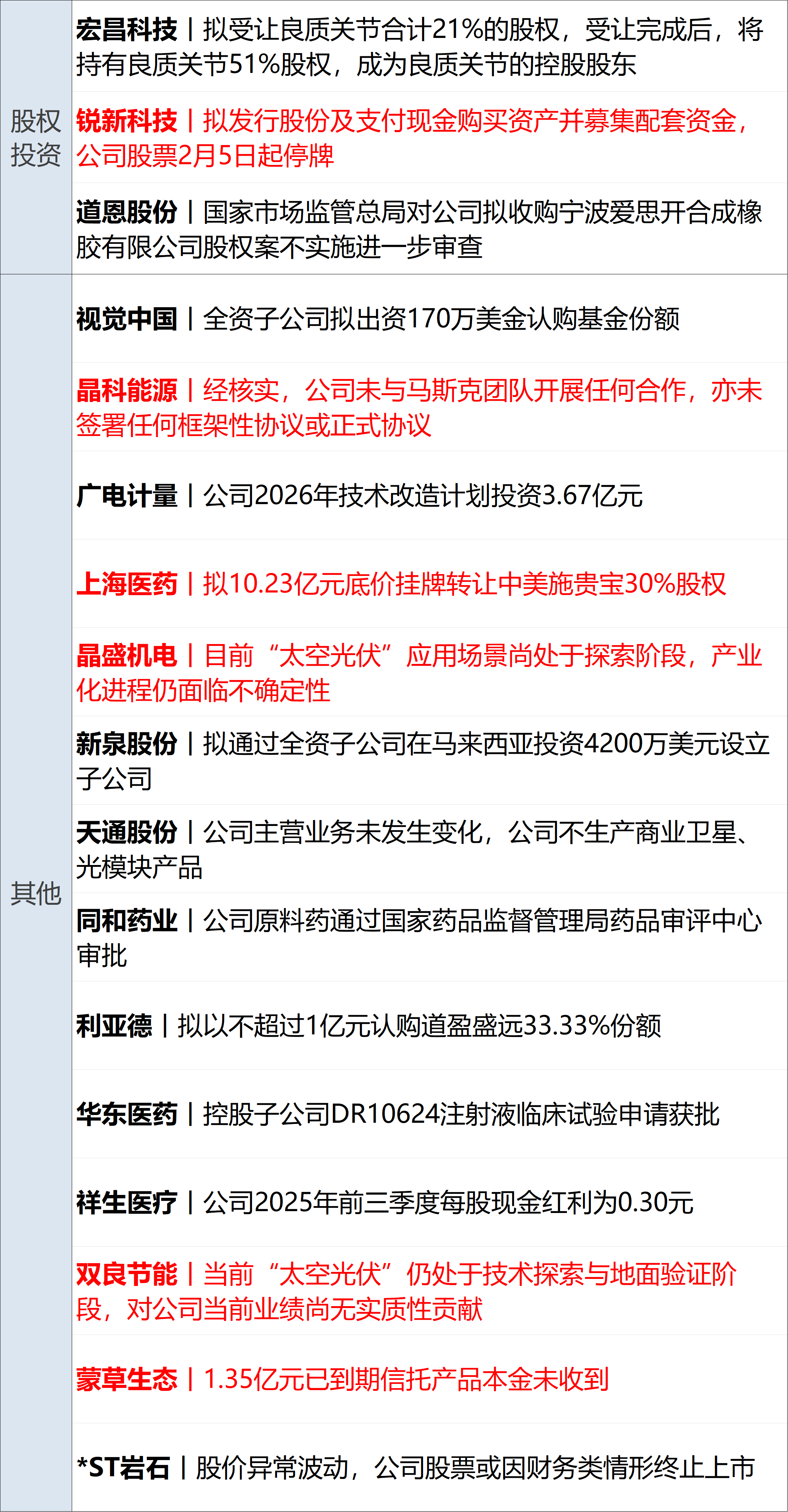 双良节能(SH600481,股价11.11元,市值208.18亿元):2月4日,双良节能公告称,近期资本市场对“商业航天”“太空光伏”等概念板块关注度显著提升,相关个股市场表现活跃。公司最近两年未确认与商业航天项目相关的营业收入,后续相关业务的开展存在一定的不确定性;公司目前尚未开展太空光伏相关的业务,对公司当前业绩无实质性影响。