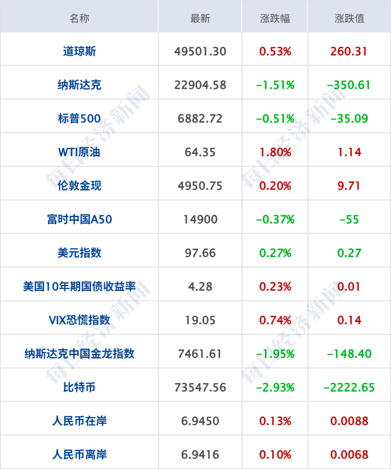 美股三大指数收盘涨跌不一,道指涨0.53%,纳指跌1.51%,标普500指数跌0.51%,热门科技股普遍下跌,AMD跌超17%,英伟达、特斯拉、博通、Meta跌超3%,谷歌、亚马逊跌超2%,苹果涨超2%;半导体设备与材料、存储概念股、加密矿企跌幅居前,闪迪跌近16%,美光科技跌超9%,西部数据跌超7%。纳斯达克中国金龙指数跌1.95%,中概股普跌,哔哩哔哩跌超6%,百度跌超4%,阿里巴巴。蔚来、小鹏汽车跌超2%,理想汽车、霸王茶姬涨超1%。