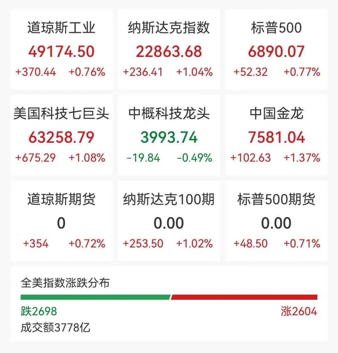 截至收盘,道指上涨370.44点,收于491174.5点,涨幅为0.76%;标普500指数上涨52.32点,收于6890.07点,涨幅为0.77%;纳指上涨236.41点,收于22863.68点,涨幅为1.04%。
