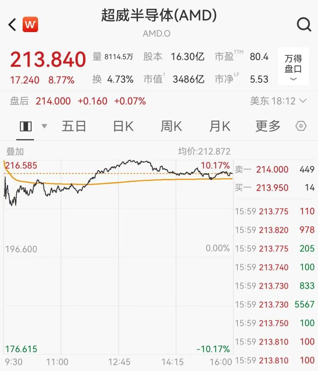 大型科技股多数上涨,AMD涨超8%,英特尔涨超5%,特斯拉、奈飞、苹果涨超2%,微软、亚马逊涨逾1%,英伟达、Meta小幅上涨;谷歌小幅下跌。