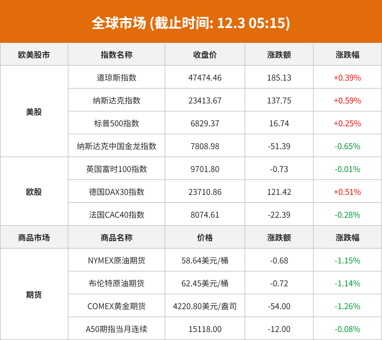 美股市场:美股三大指数12月02日收盘全线上涨。截至收盘,道琼斯工业平均指数比前一交易日上涨185.13点,收于47474.46点,涨幅为0.39%;标准普尔500种股票指数上涨16.74点,收于6829.37点,涨幅为0.25%;纳斯达克综合指数上涨137.75点,收于23413.67点,涨幅为0.59%。