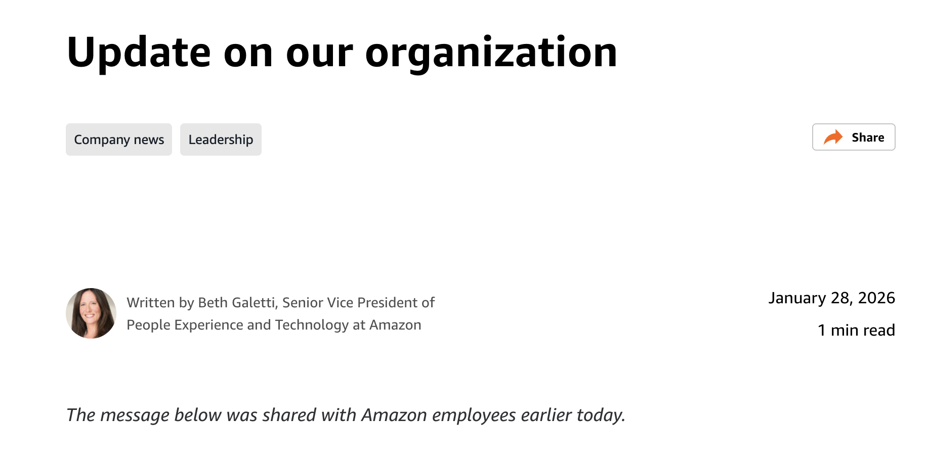 1月28日,贝丝·加莱蒂发文证实了消息,宣布调整组织架构,预计裁减约1.6万个职位。这些裁员是亚马逊去年10月开始的裁员计划的延续。她指出:“虽然许多团队已于去年10月完成组织调整,但部分团队的工作直至当前才告完成。”