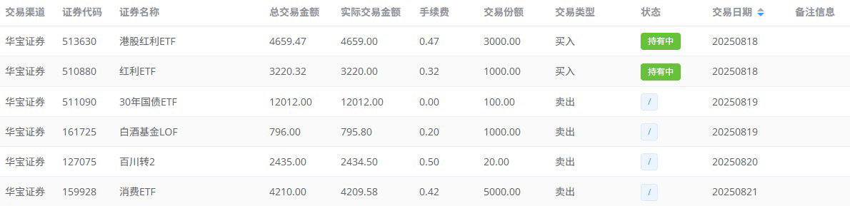 ETF网格总计买入15只ETF,已经盈利清仓的有9只,目前持仓的有6只,分别是消费ETF、食品饮料ETF、沪深300ETF、基建工程LOF、红利ETF、港股红利ETF。