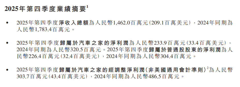 业绩公告显示,汽车之家2025年第四季度净收入总额为14.62亿元,相较2024年同期的17.83亿元,出现显著下滑。盈利能力亦未能幸免,2025年第四季度归属于汽车之家的净利润为2.34亿元,较2024年同期的3.21亿元大幅减少。衡量其核心经营表现的经调整净利润同样遭遇重创,从2024年第四季度的4.87亿元骤降至2025年同期的3.04亿元。