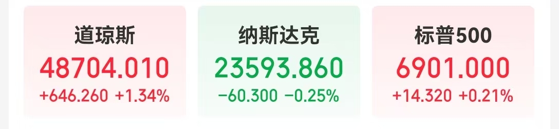 当地时间12月11日,美股三大指数收盘涨跌不一,道指上涨646.26点,涨幅1.34%;纳指跌0.25%;标普500指数涨0.21%。