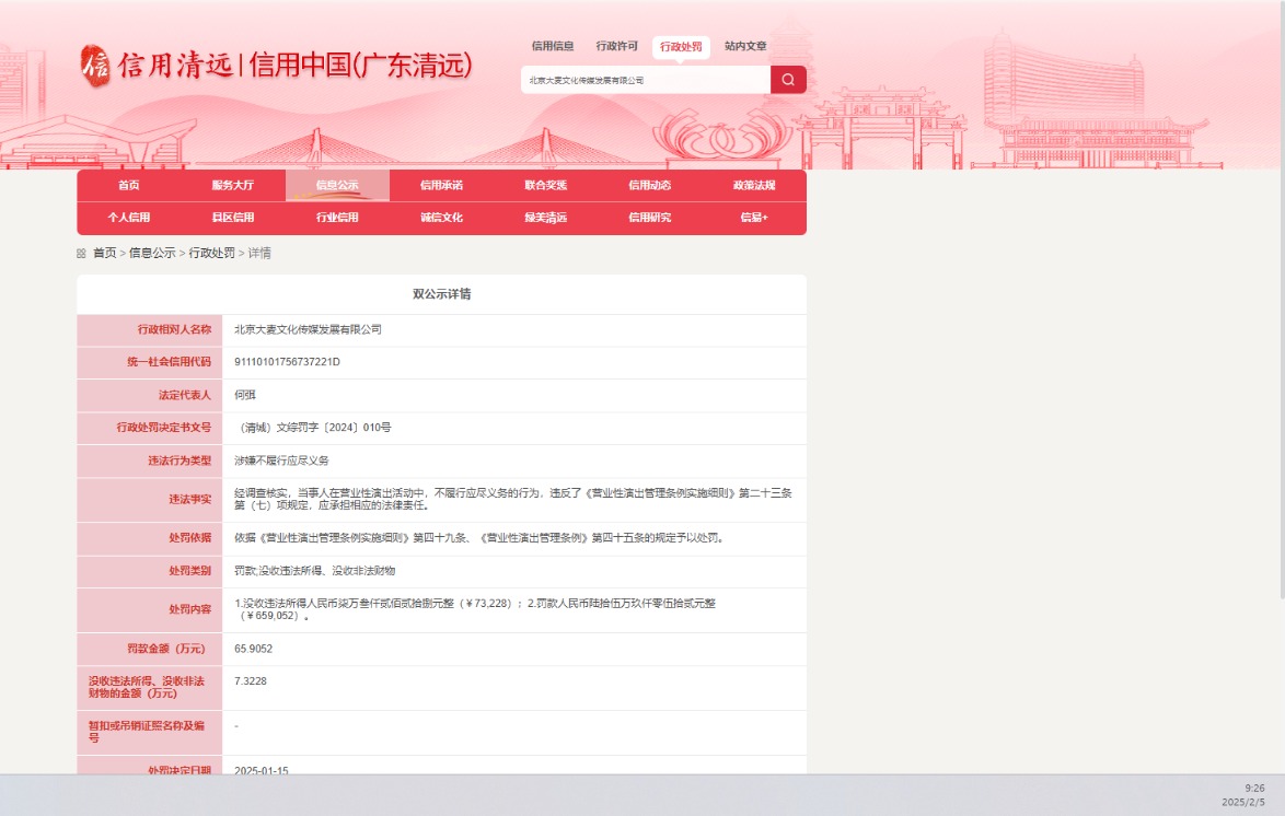 【大河财立方记者杨霄实习生杨玉涵】2月5日,天眼查天眼风险信息显示,在上月中旬,北京大麦文化传媒发展有限公司因在营业性演出活动中不履行应尽义务的行为,违反了《营业性演出管理条例实施细则》第二十三条第(七)项规定,被广东省清远市清城区文化广电旅游体育局没收违法所得7.3万余元,罚款65.9万余元。大麦的前身是中国票务在线,2003年正式运营,2017年该公司加入阿里巴巴大文娱板块。
