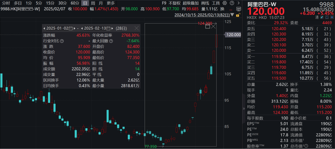 2月12日,阿里港股最终收涨8.48%,市值也来到2.2万亿港元上方。今年以来,阿里巴巴港股累计涨幅超过45%。