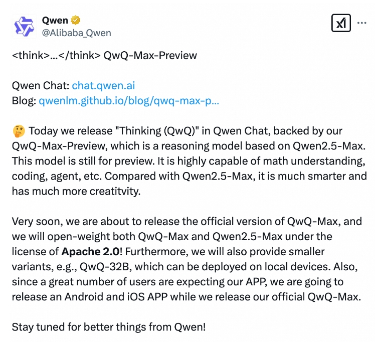 通义千问团队表示,未来将发布QwQ-Max的正式版本。