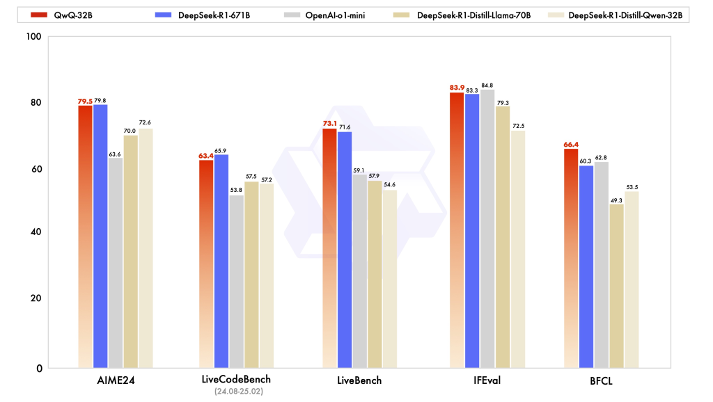 QwQ-32B模型和R1、OpenAI-o1-mini等知名模型的评分比较。来源:阿里通义