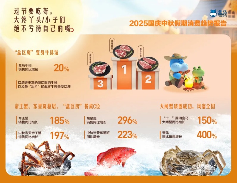 盒马10月8日发布的销售数据显示,“十一”期间,以帝王蟹、东星斑、牛排为代表的高档品质商品成为各地消费者的首选,尤其是在中山、珠海、东莞三地的盒马鲜生门店,在客流量、成交额、翻台率等核心指标上,全面超越北上广深等一线城市门店,整体表现亮眼。